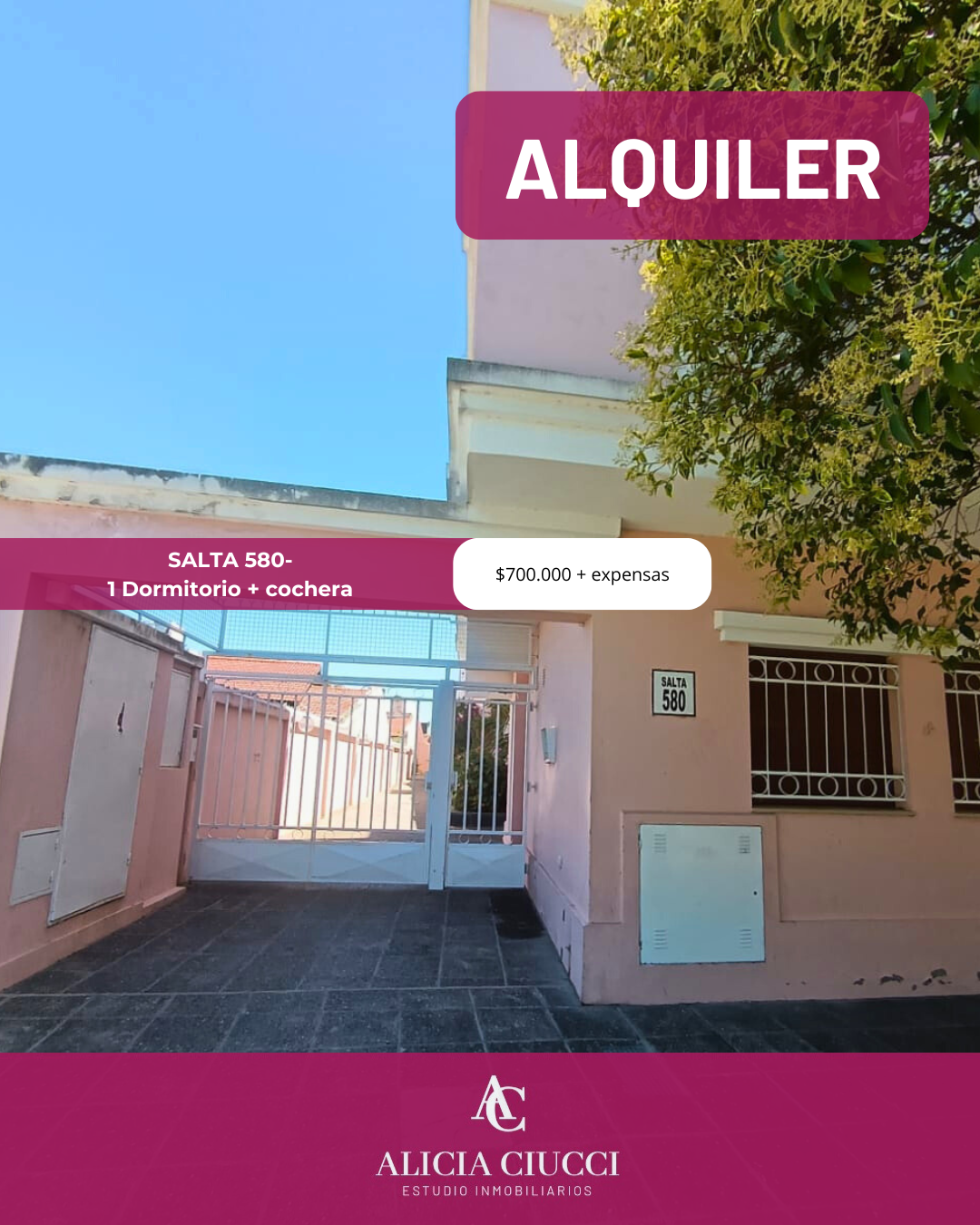 Departamento en alquiler! En Calle SALTA 580 $700.000 Detalles Departamento en alquiler Calle SALTA 580 living comedor aire acondicionado cocina integrada separada x barra desayunadora pequeño patio tender baño completo 1 dormitorio con placard cochera semicubierta VALOR: $700.000 + expensas para más información comunicarse al 2914399062 Share on Facebook Tweet Pin it LinkedIn Tipo de Propiedad: Departamento Tipo de operación: Alquiler Dormitorios: 1 Ciudad: Bahía Blanca